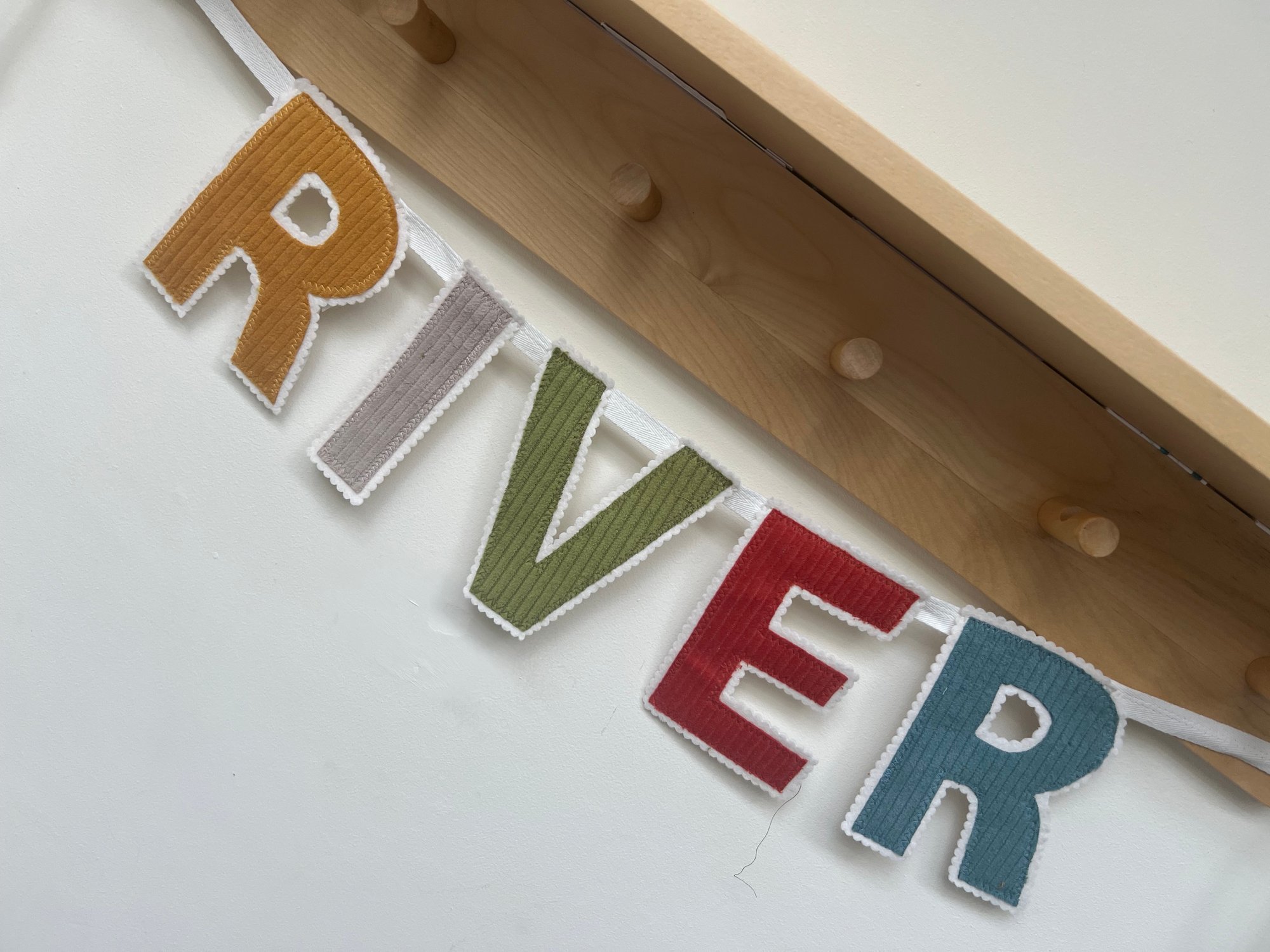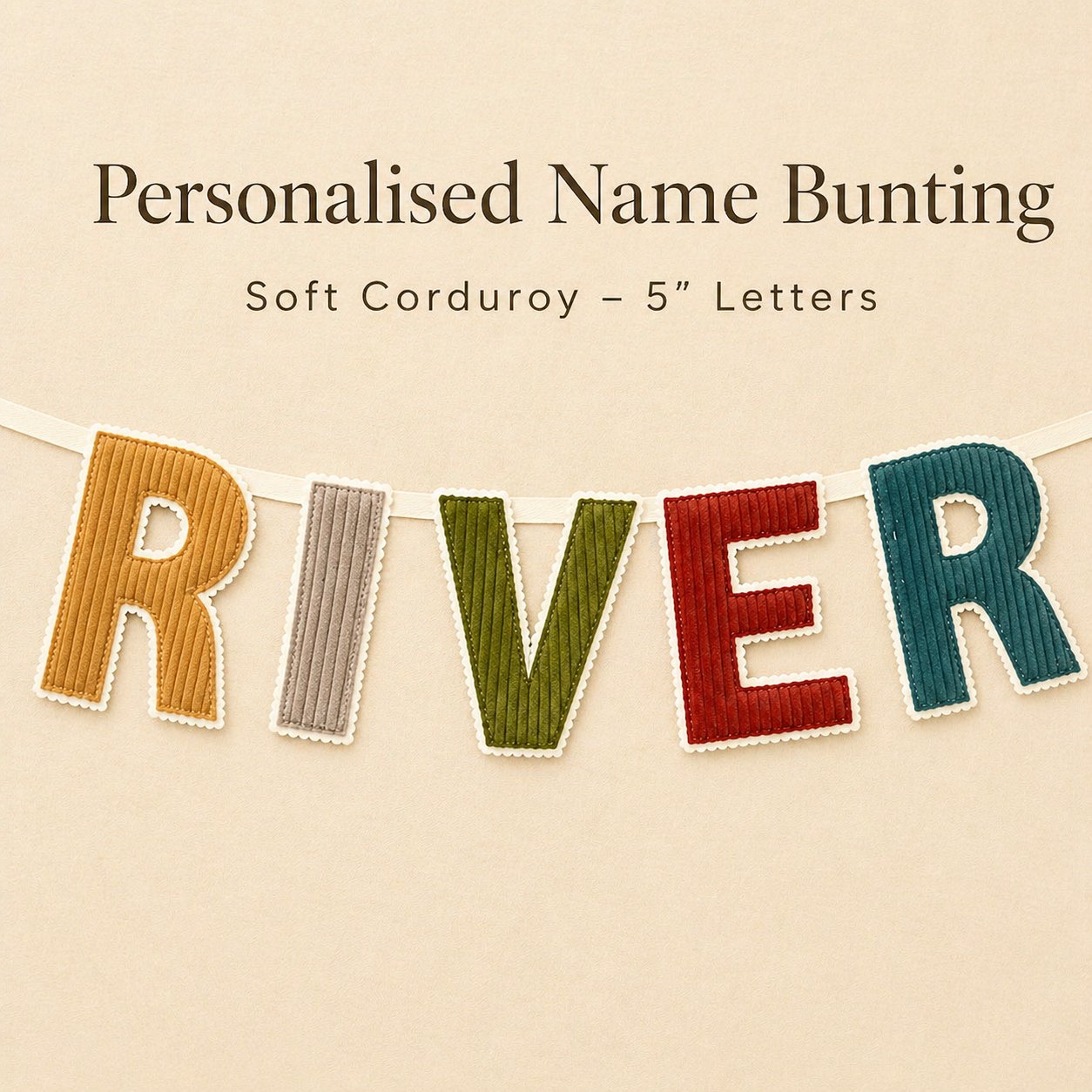 Add warmth and texture to your child’s space with this handmade corduroy letter bunting, designed in a soft earthy palette for a cosy, modern nursery feel.