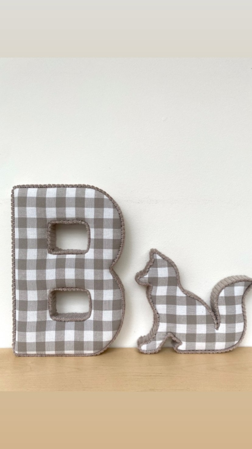 Create a beautiful personalised baby name letter & fox set, made using soft beige check fabric perfect for a neutral nursery wall, baby name signs, or a custom nursery name display for your little one’s room.